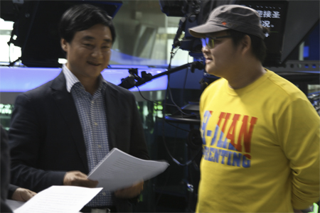 三位企业家在演播厅合影