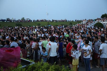 广场上、江堤上、围栏上的观众