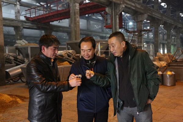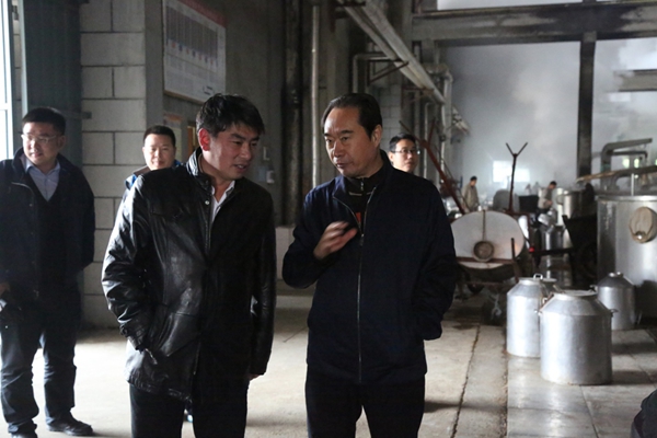 星空体育酒业总裁曹荣开陪同秦书尧、朱玉祥等一行在酿造三车间参观